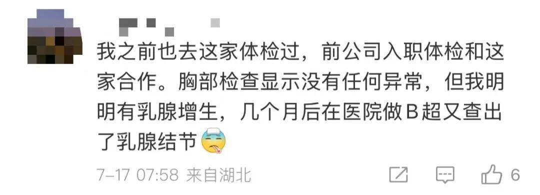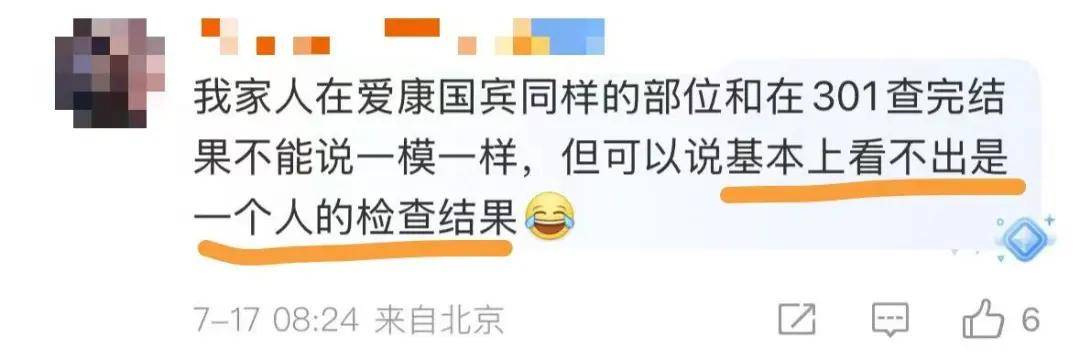 此事件也引发大量网友对体检机构的讨论,类似经历并非个例。有网友表示家人在爱康国宾与医院的检查结果“判若两人”,“同一部位检查几乎看不出是同一个人的报告”。