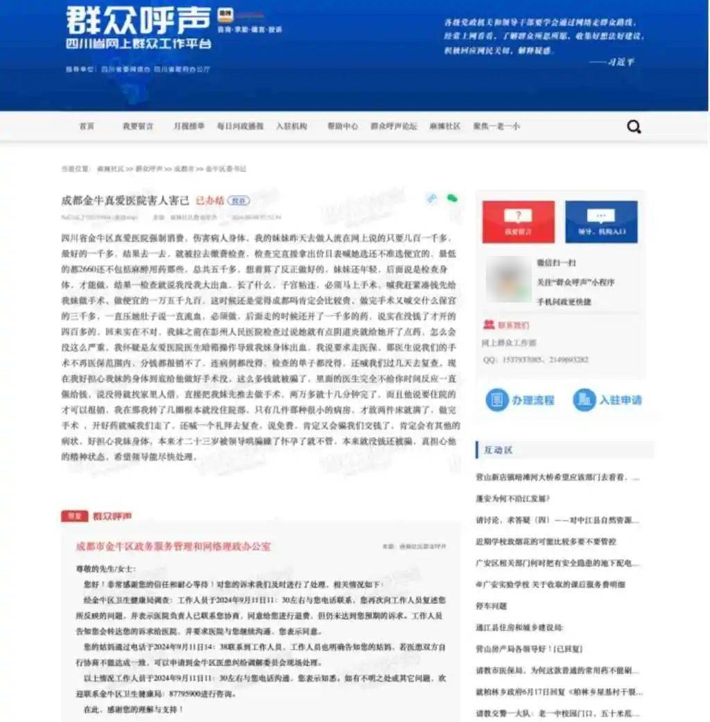 2024年9月8日,四川省网上群众工作平台“群众呼声”公开的一则投诉,举报人反映其妹在金牛区真爱医院做人流手术时,遭遇低价诱导(宣传一千元左右)、术中强制升级高价项目(从五千涨至两万),并被临时诊断需紧急处理“子宫粘连”。院方未提供病历且拒走医保,手术十几分钟完成,并无正规住院部的环境。该家属质疑诊疗真实性,担忧患者身心受损,呼吁调查。成都市金牛区政务服务管理和网络理政办公室回复称,投诉人已与医院进行协商退费,但退还金额未达预期,工作人员会将诉求转达给医院,并告知若医患双方自行协商不能达成一致,可以申请到金牛区医患纠纷调解委员会现场处理。目前,该投诉显示“已办结”。