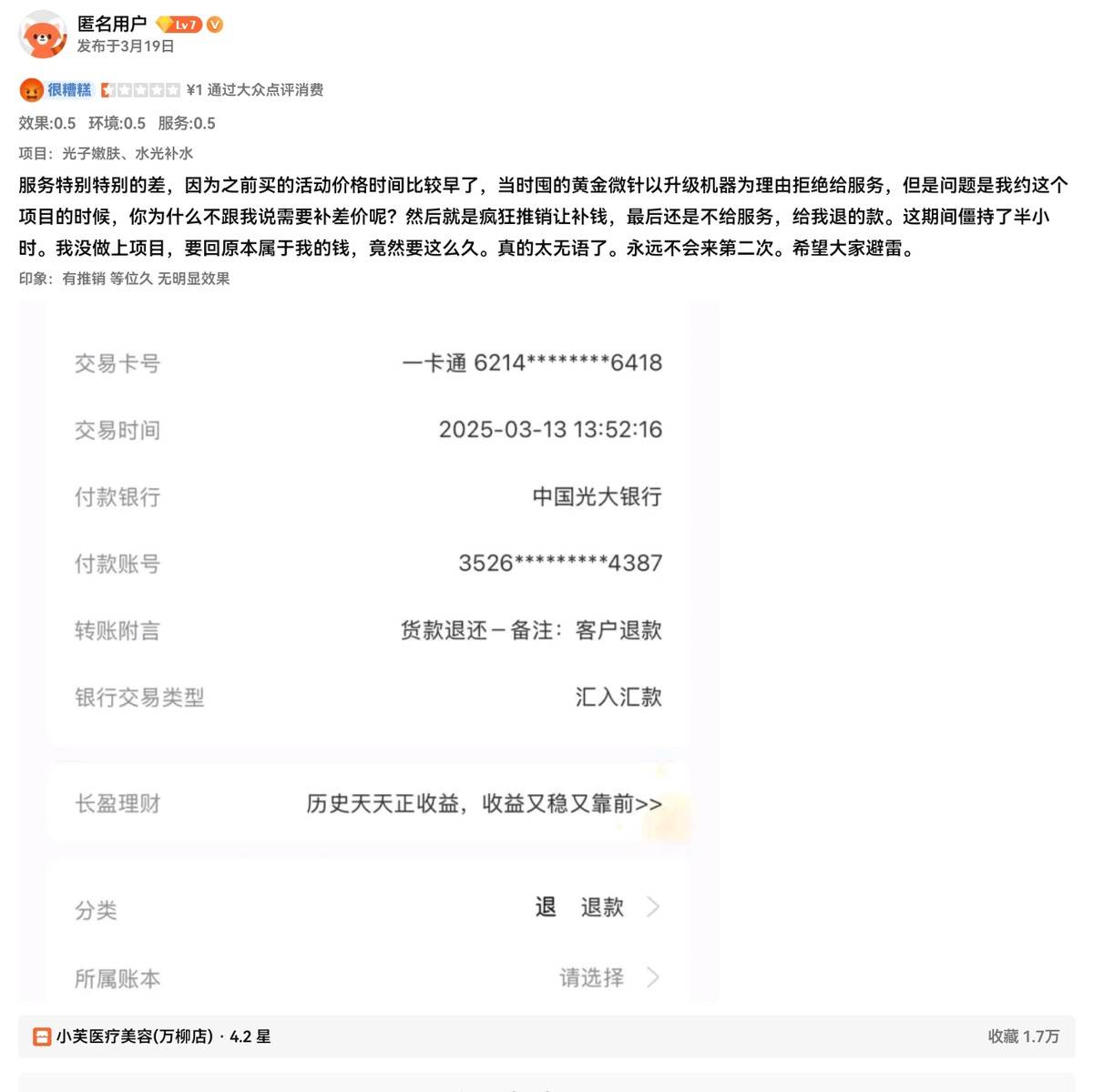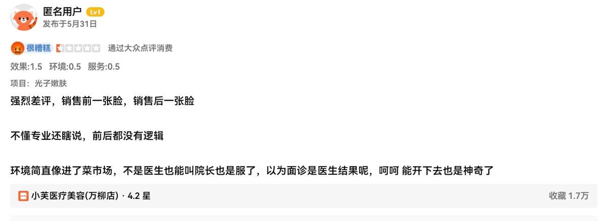 5月31日,一位消费者通过大众点评在小芙医疗美容(万柳店)购买了光子嫩肤项目,给出了差评。