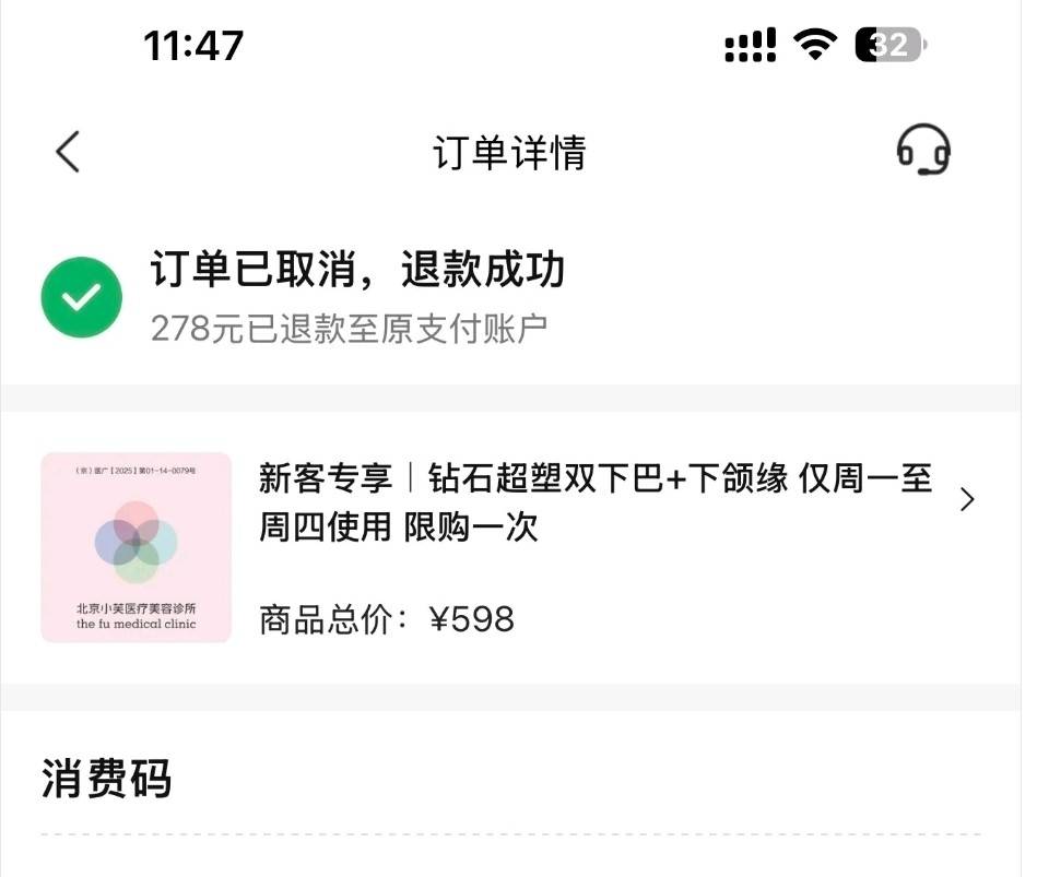 该网友指出,行业内普遍认知是该项目的核心价值在于“爆脂”功能,缺乏此功能则项目效果大打折扣。在面诊人员的引导下,该网友选择退掉团购券,转而按照诊所店内标价640元通过扫码支付了项目费用。