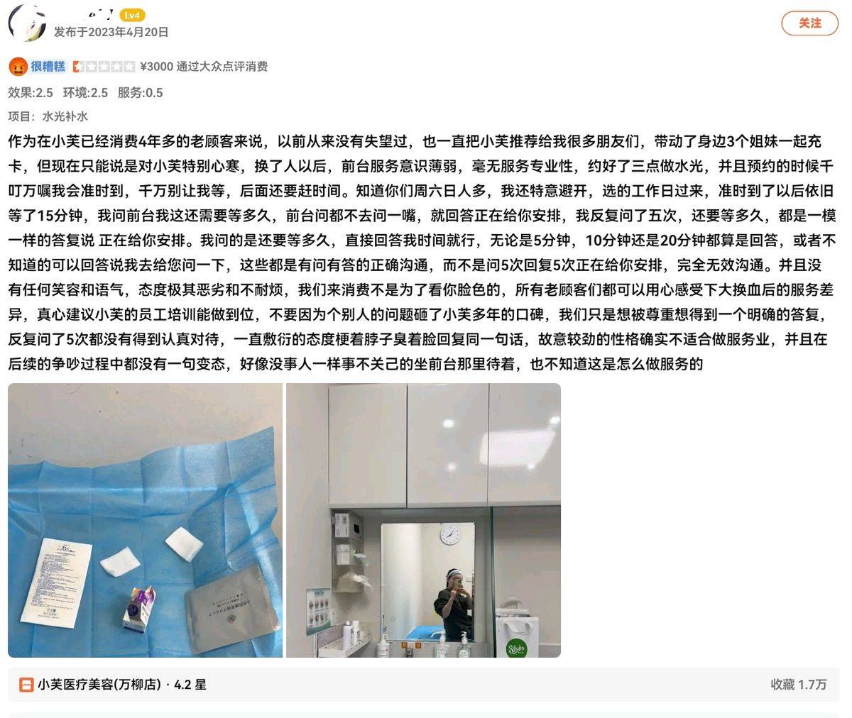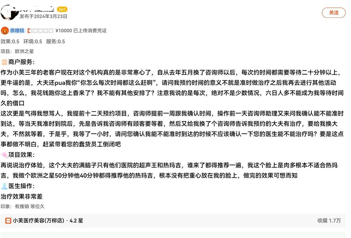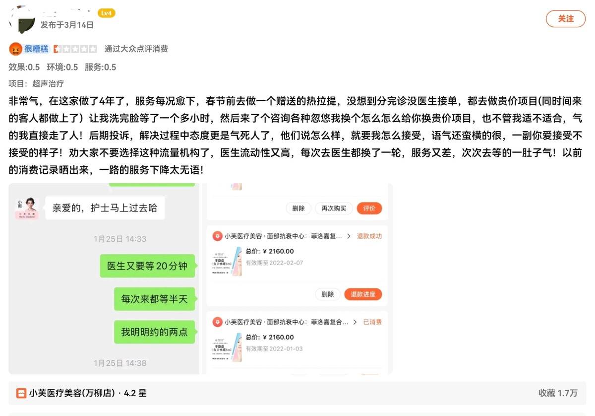 更令人深思的是来自老顾客的失望之声。3月14日,一位自称在该诊所接受服务长达四年的消费者描述了自己消费体验断崖式下滑的经过。