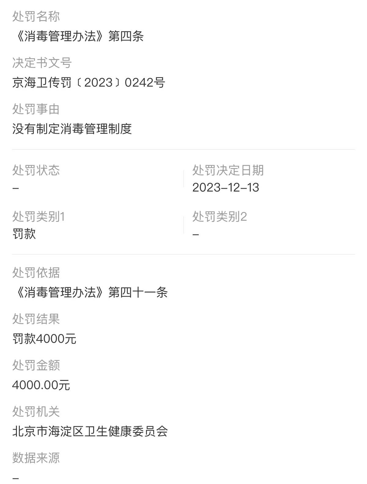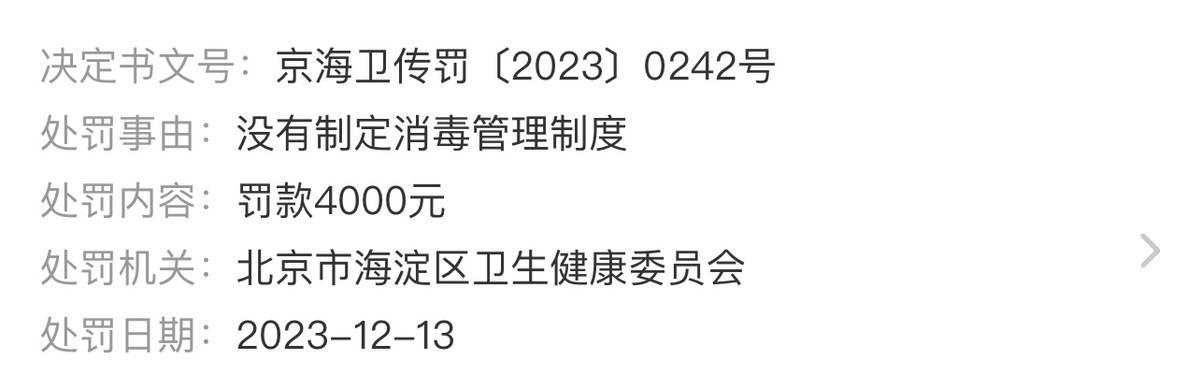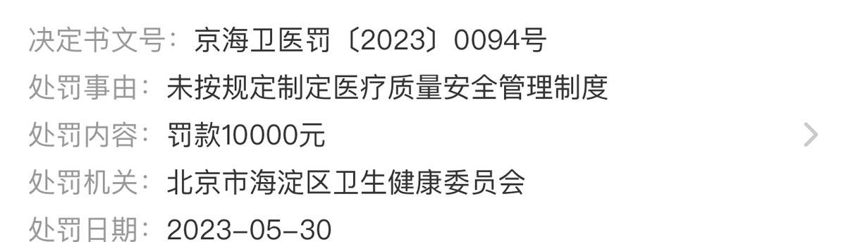 2023年12月13日,北京小芙医疗美容诊所有限公司因没有制定消毒管理制度,违反了《消毒管理办法》第四条,北京市海淀区卫生健康委员会依据《消毒管理办法》第四十一条,对其处以罚款4000元的行政处罚。