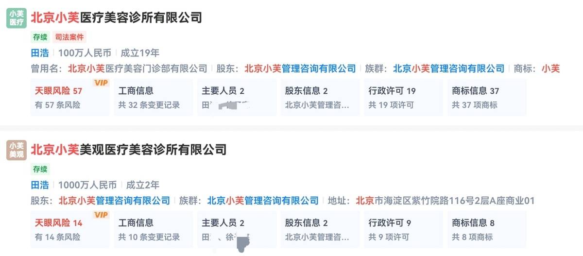 值得深入了解的是,这家看似业务多元的机构,其经营风险却不容忽视。根据天眼查数据显示,该诊所涉及的风险条目众多,包括13起司法案件、7条涉诉关系、22条深度风险信息以及3次行政处罚记录,此外还存在一些经营纠纷。该诊所在北京实际运营着两家机构,分别是北京小芙医疗美容诊所有限公司和北京小芙美观医疗美容诊所有限公司,两家机构的法定代表人均为同一人。