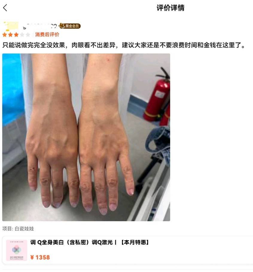 6月1日,有消费者在美团上发表了一条评价,该消费者对在该机构所做的美白项目感到失望,项目名称为调Q全身美白(含私密)调Q激光,价格为1358元。