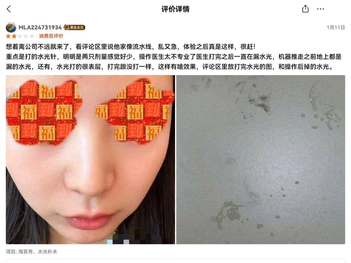 该消费者提到,该机构操作医生不专业,医生打完后一直在漏水光,机器推走之前地上都是打漏的水光。该消费者还提到,水光打在表层,打完跟没打一样,没有效果。