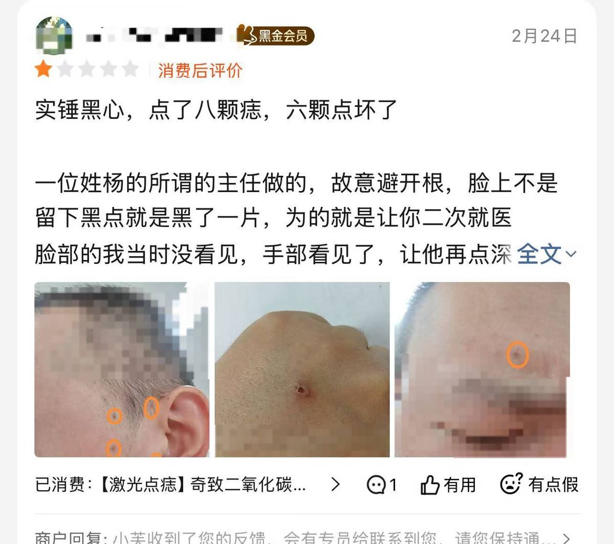 2025年2月24日,另一位消费者在美团点评了自己小芙医疗美容诊所进行的激光点痣服务。