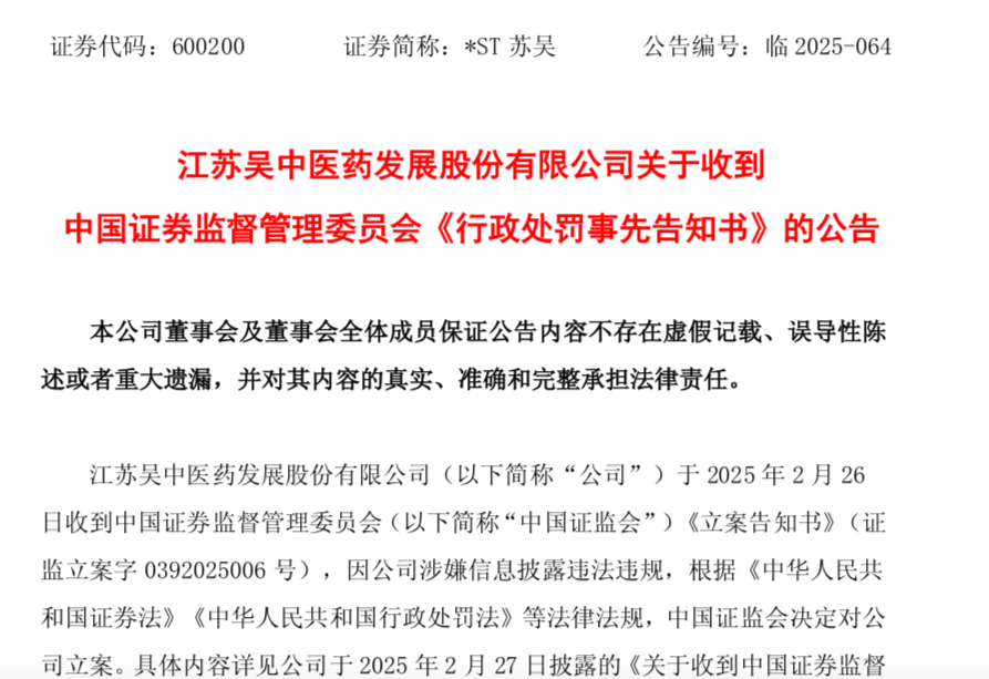 中国证监会出具的《行政处罚事先告知书》显示,因*ST苏吴存在虚假记载、重大遗漏等事实,公司及高管拟被处以罚款共计3050万元,董事长被采取10年证券市场禁入措施。同时,该公司触及上市规则中重大违法强制退市情形,后续将根据最终作出的行政处罚决定,依规实施退市。