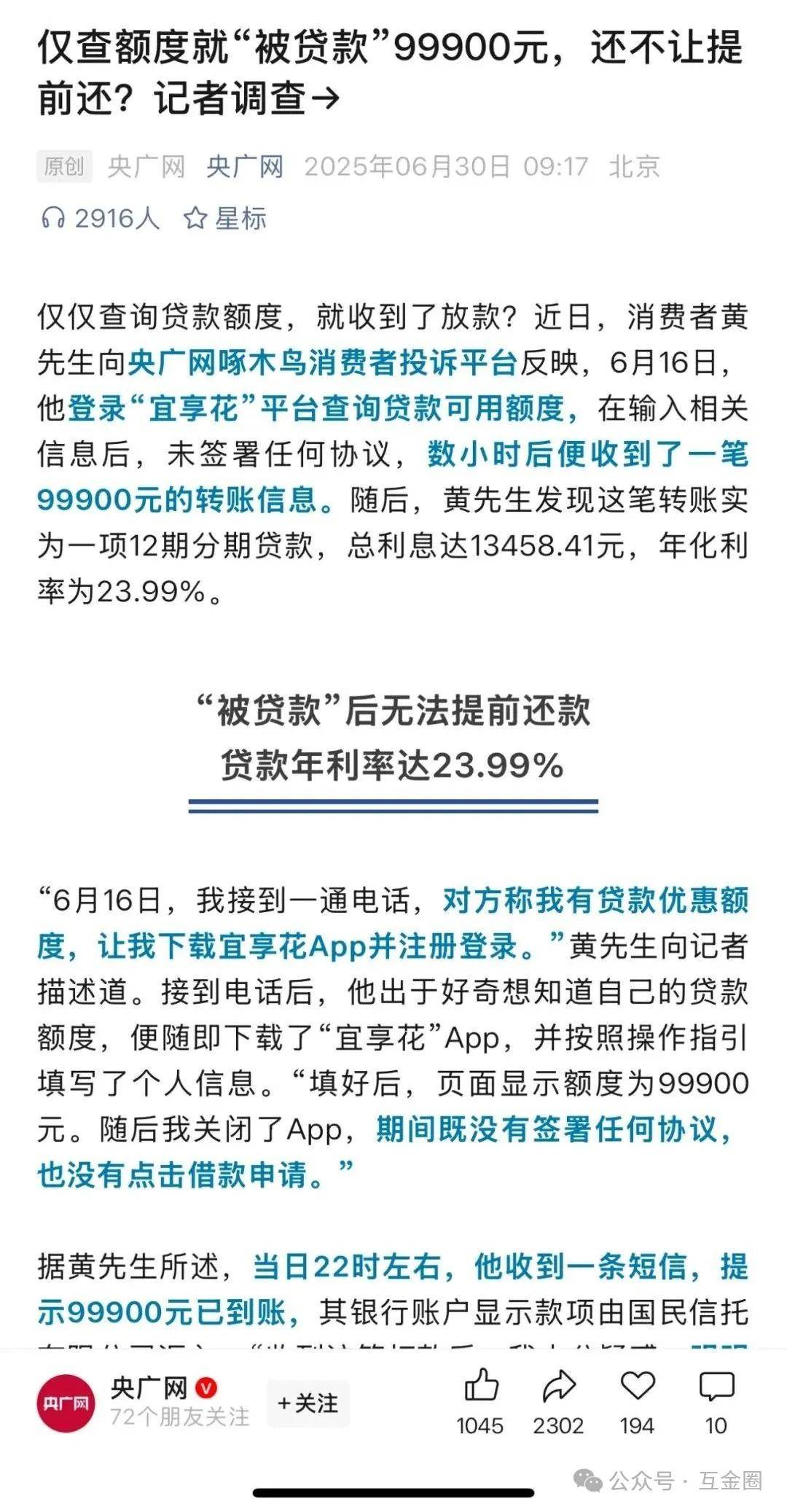 央媒点名宜享花:网友查额度即"被贷款"9.99万 涉嫌强制下款