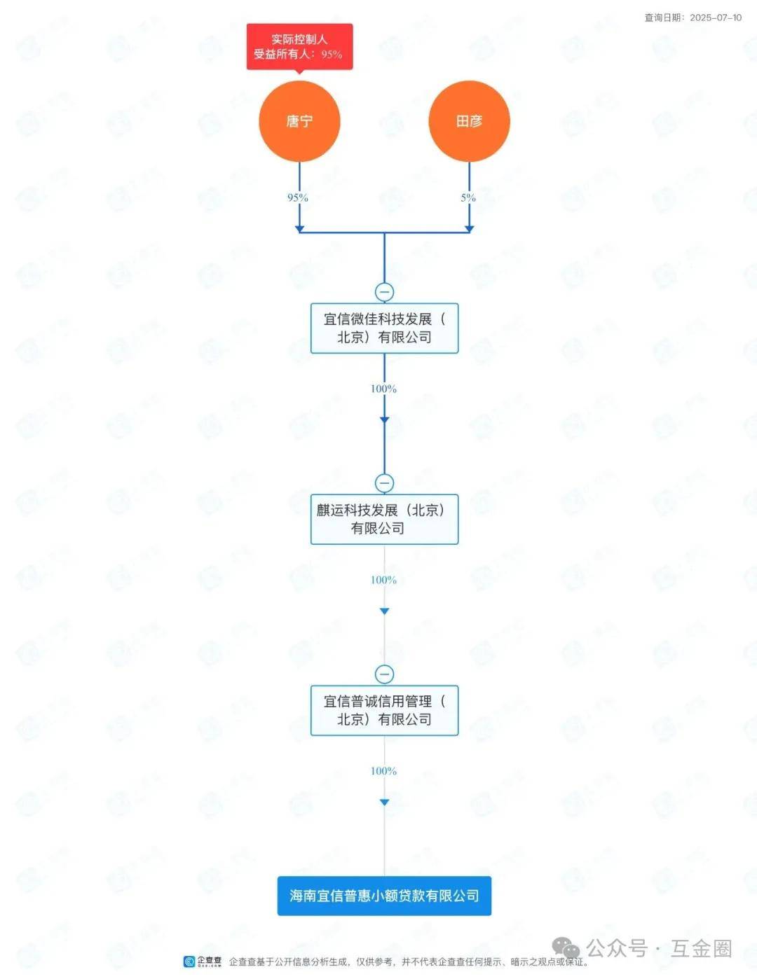 宜享花产品宣传页面显示:宜享花是纯线上信用借款产品,年化利率(单利)7.2%-35.99%,资金来源为:海南宜信普惠小额贷款有限公司(简称“宜信小贷”)。企查查显示,该公司法人为唐宁(总持股比例:95%)。