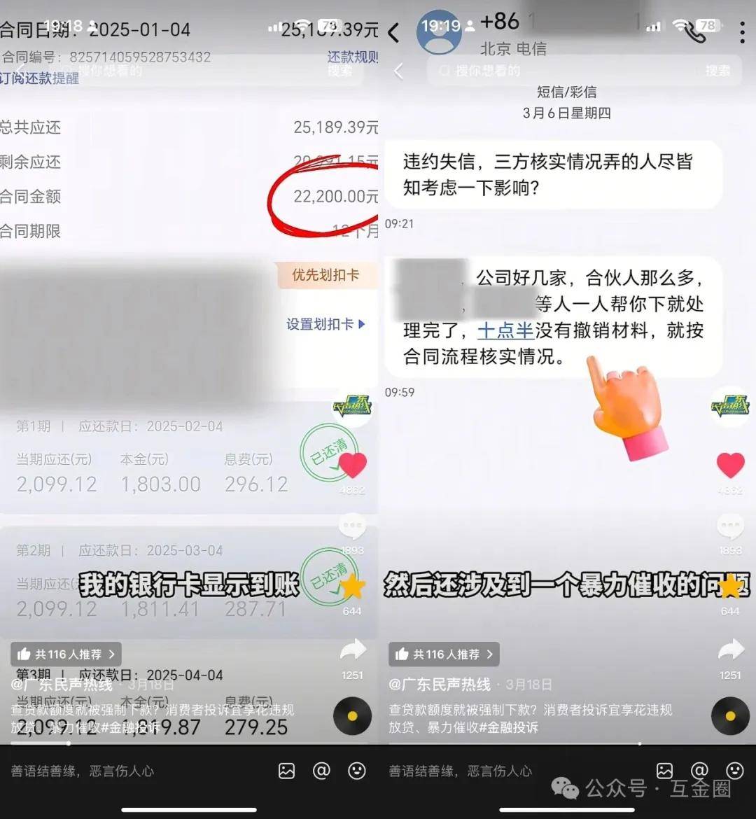据央广网报道,黄先生的遭遇并非个例,安徽的杨女士也遭遇过类似事件。因看到宜享花广告宣称的“贷款利率低,点击即可查看额度”,杨女士在宜享花平台输入个人信息后疑似被“强制放款”8万元。杨女士的维权之路也并不顺畅,宜享花客服向杨女士提供了一个账号,要求她采用对公转账的方式将本金全部转入该账号,但杨女士害怕会跌入更深的“套路”之中。最终,杨女士在某投诉平台的协助下,成功划扣了全部本金。