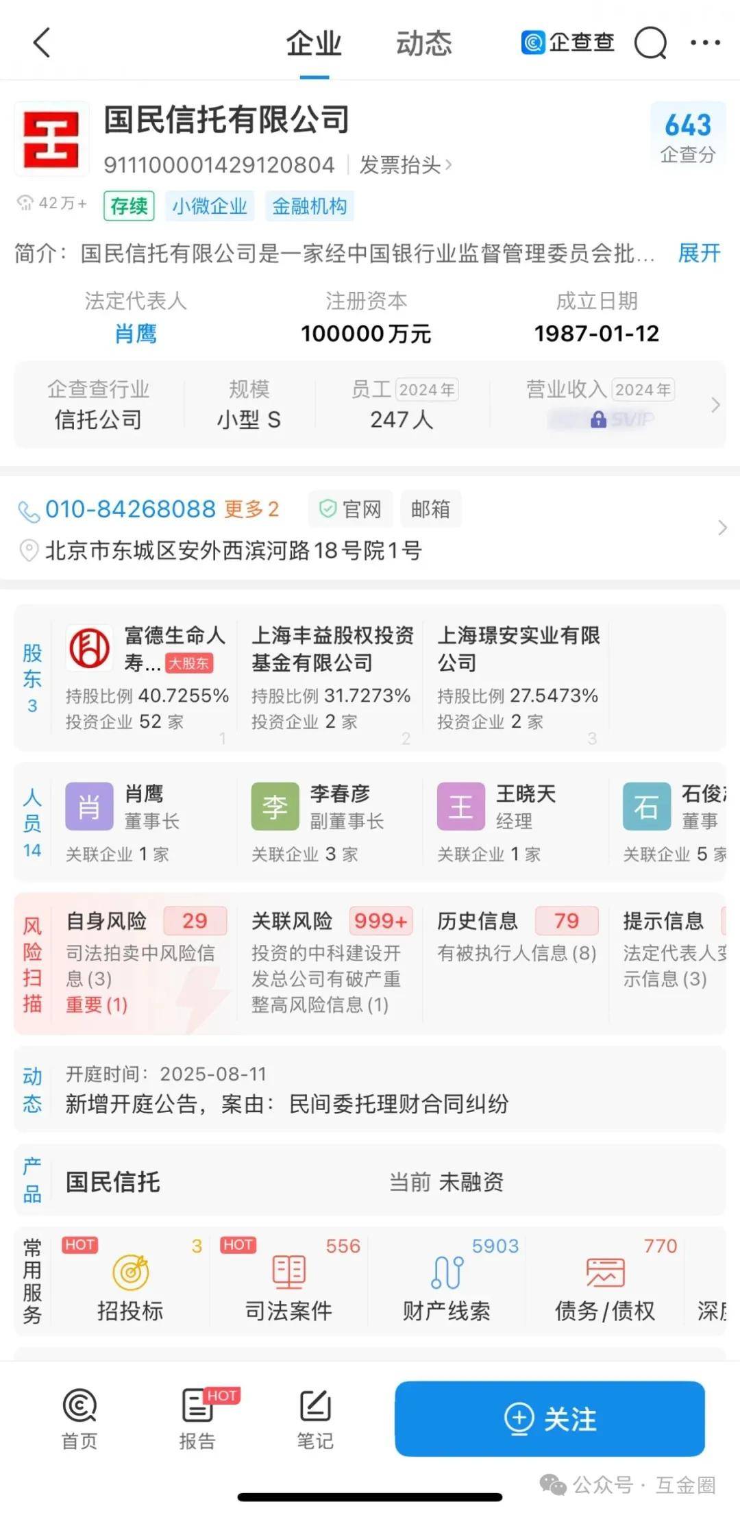 企查查显示,国民信托有限公司注册资本10亿元,法人为肖鹰,该公司关联风险高达999+。
