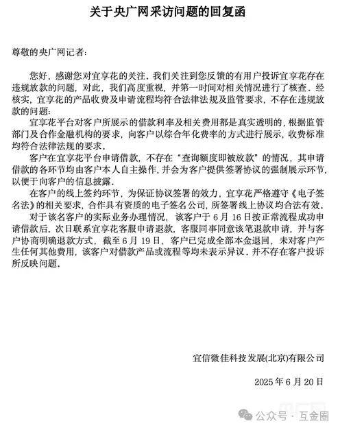 针对黄先生的投诉,6月19日,央广网记者向宜享花App运营方宜信微佳科技发展(北京)有限公司进行求证。6月20日,该公司发送回复《关于央广网采访问题的回复函》。回函中提到:宜享花不存在“查询额度即被放款”的情况,借款全流程由客户自主操作,协议设置强制展示环节,保障信息充分披露。