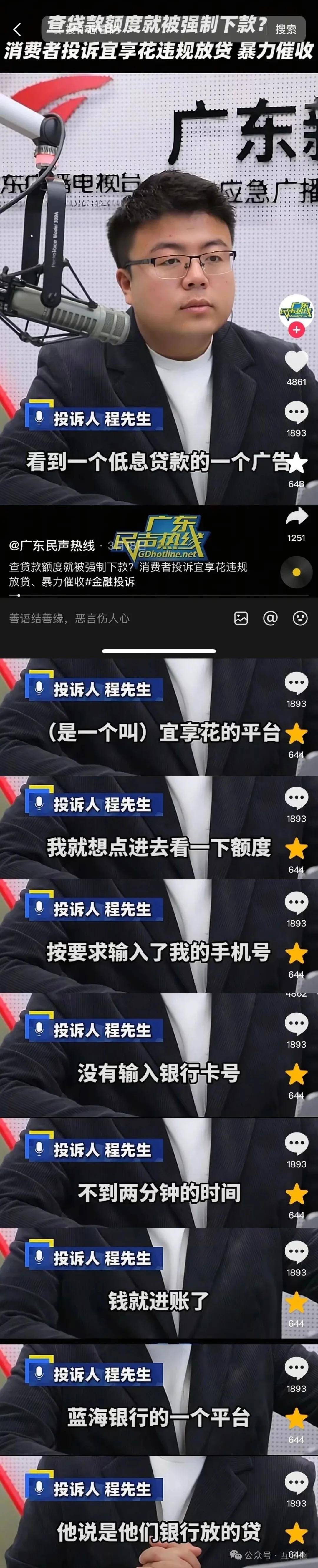 早在今年3月,《广东民声热线》曾报道过有关宜享花涉嫌“强制下款”的新闻,用户程先生疑似“被放款”22200元而向《广东民声热线》求助,该笔贷款由蓝海银行发放。令人称奇的是,据用户描述:整个放款过程中,用户并未填写过个人银行卡账号。