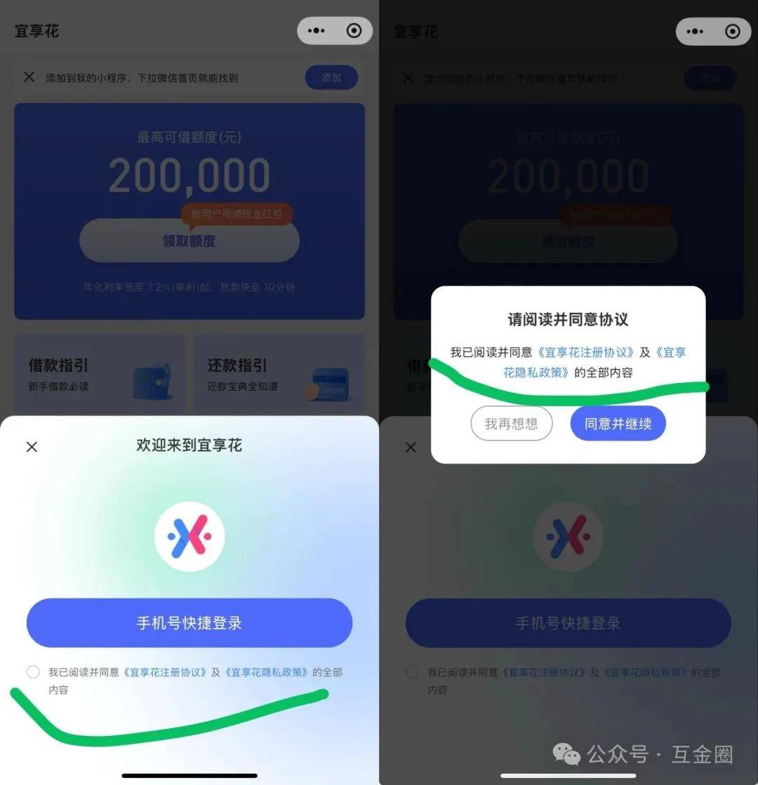 7月10日,「互金圈」测试发现,打开「宜享花」小程序,点击「领取额度」,不勾选下方的「我已阅读并同意《宜享花注册协议》及《宜享花隐私政策》的全部内容」,而是选择「手机号快捷登录」,下一步页面提示「我已阅读并同意《宜享花注册协议》及《宜享花隐私政策》的全部内容」,在这里,用户很容易误点击选择「同意并继续」。不知宜享花这样的交互设计,是否有意为之?!