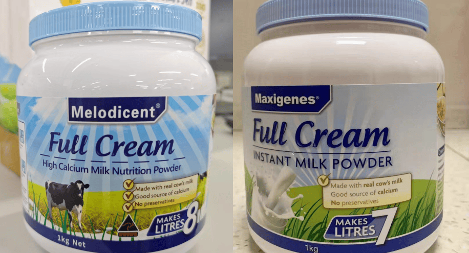 左:澳可佳“Melodicent全脂高钙牛奶营养粉”。右:网红澳洲奶粉“美可卓”。电商平台截图