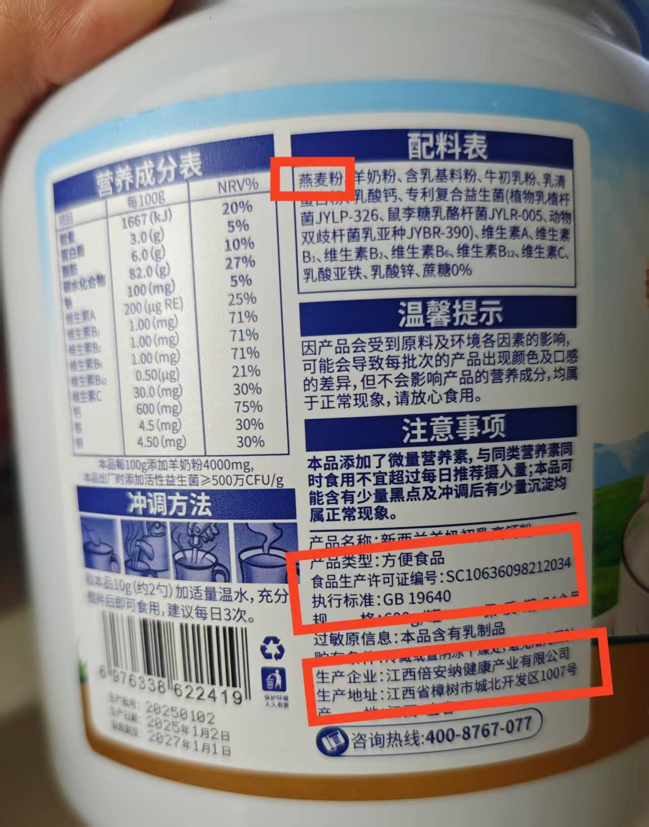 新京报记者调查发现,这款百香萱“新西兰羊奶初乳高钙粉”实际产地为江西宜春,产品类型并非乳粉或调制乳粉,而是方便食品。其主要成分是燕麦粉,执行的是《冲调谷物制品》标准。据厂家介绍,该产品为客户定制产品,定制成本每罐仅10元,产品名称中的“新西兰羊奶”字样仅指添加了4%的进口羊奶粉原料。所谓的“香港纽崔莱公司”是客户在香港注册的一家公司,与人们熟知的安利纽崔莱公司没有关系。