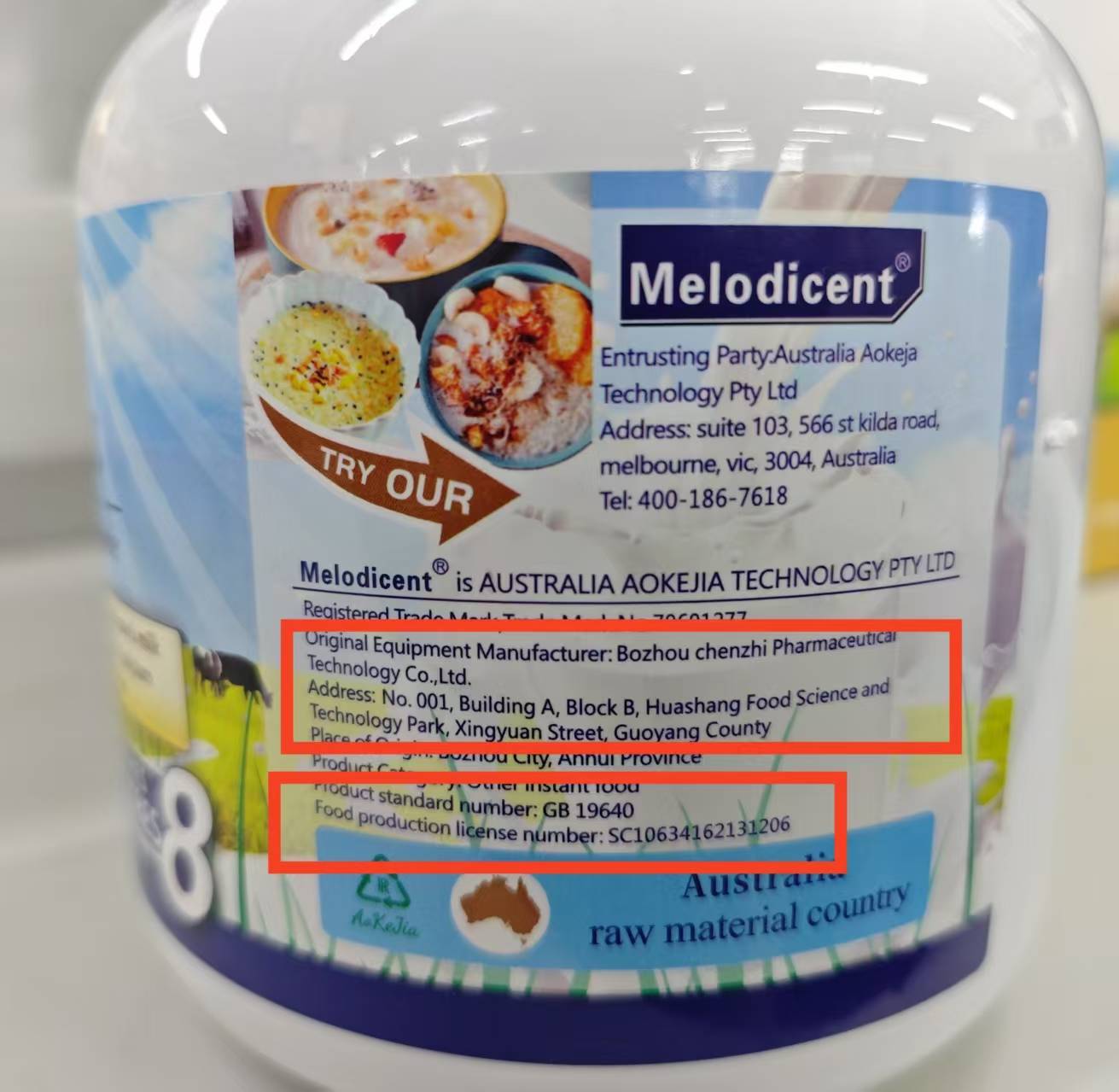 仔细查看右侧的英文生产信息可以发现,该产品标注的“Original Equipment Manufacturer”,即原设备制造商,是来自“Bozhou City,Anhui Province(安徽省亳州市)”的一家企业。“Food production license number”即食品许可生产证号,也是SC开头的国内证号,但产品包装上没有69开头的代表中国商品的条形码,仅有93开头的代表澳洲商品的条形码。