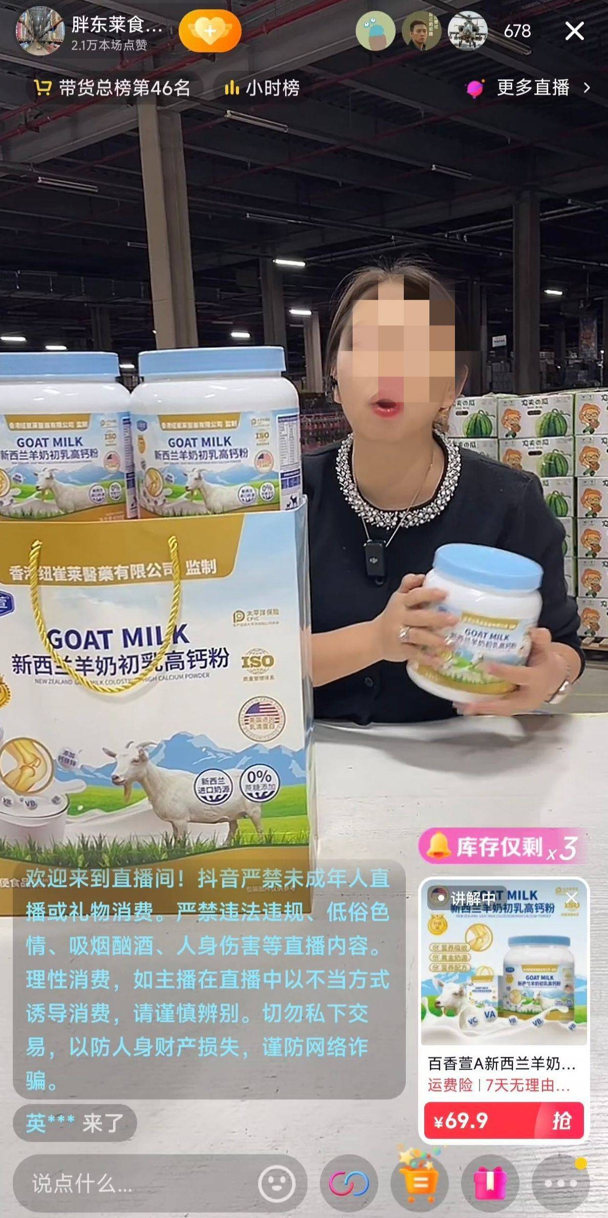 “它叫香港纽崔莱新西兰羊奶初乳高钙粉,营养价值特别高,平时买特别贵,我不说多少价了……一桶,两桶,随便都得这个数,今天我给你破价,99不开,69块9冲!刚才有一个姐姐跟我说没喝过羊奶粉,不知道会不会适应这个味道。没关系,今天妹子给你加一桶试喝……”近期,在“胖东莱食品中转仓(现已更名‘范范食品中转仓’)”直播间,主播极力推荐一款百香萱“新西兰羊奶初乳高钙粉”,并给出69.9元买2桶还额外赠送1桶试喝的优惠力度。