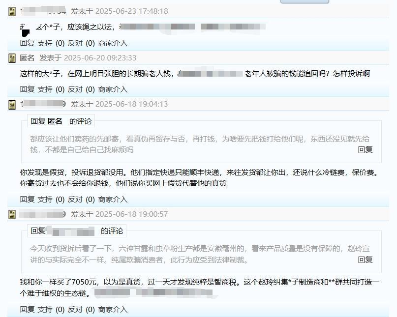 记者在包装盒上的成分栏看到,其成分构成为“纯化水、红花、雪莲培养物3%、桑椹、黄精0.5%、人参(人工种植)3%、紫苏、人参果、松茸、平卧菊三七。”产品类别为“其他饮料”,与赵某在直播间宣称的“神药”完全不符。此外,有媒体曾于2024年曝光了“六神甘露”并非药品,近期多人在评论区表示自己被骗了,并明确称“赵某就是骗子!”