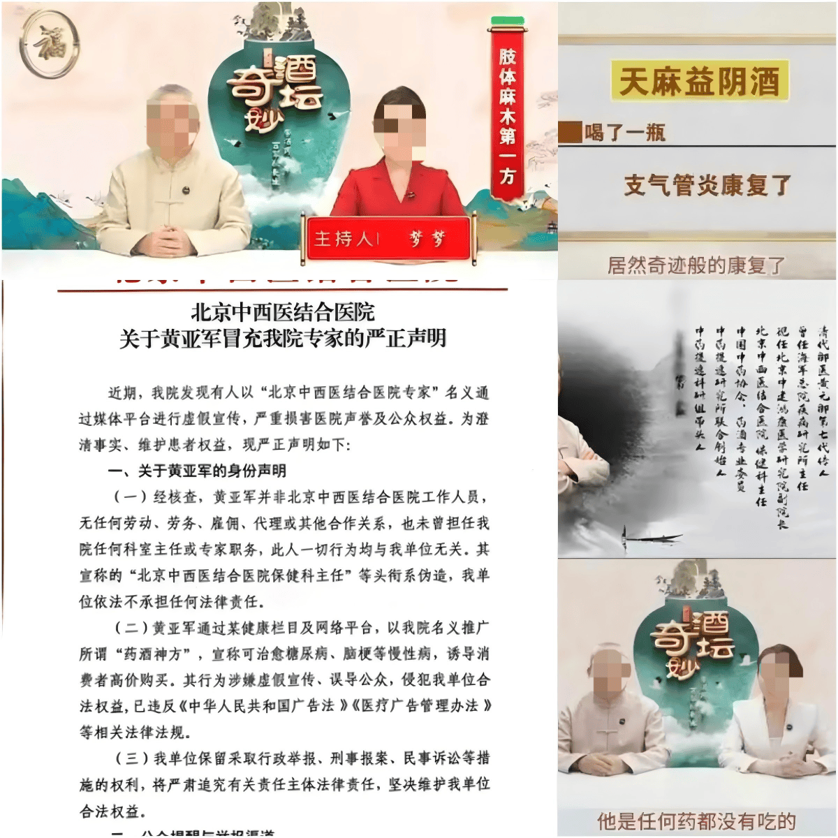 从法律层面来看,“夸大宣传” 是对产品真实功效的过度渲染,属于违规范畴;而 “虚假宣传” 则已触及法律红线。以《奇酒妙坛》为例,主讲人黄亚军,报道中的其他头衔没有公布证据,但是假冒 “北京中西医结合医院保健科主任医师” 身份,已经被北京中西医结合医院声明是假冒,此类行为不仅违反《广告法》,更涉嫌触犯《刑法》中的虚假广告罪。