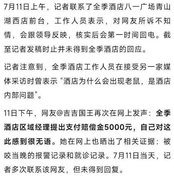 女子称入住全季酒店半夜被老鼠咬醒:酒店提出赔偿5000元
