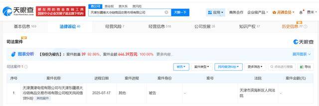 此外,天津东疆港大冷链商品交易市场有限公司因涉及民间借贷纠纷案件被起诉,该案将于7月17日在天津市滨海新区人民法院开庭审理。
