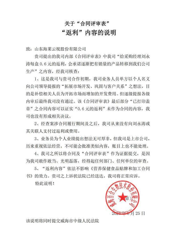 在这份官方《说明》中,百合股份对“返利”一事给出了官方定性。该公司称,这仅仅是其“业务员单方以个人名义向公司领导提报的‘拓展市场开发、巩固与客户关系’之想法”,并进一步强调,该想法“逐级提报各级内审后最终我司没有通过”。而支撑其“未通过”结论的核心理由,便是“返利”条款并未出现在最终打印盖章的对公《合同》文本中。