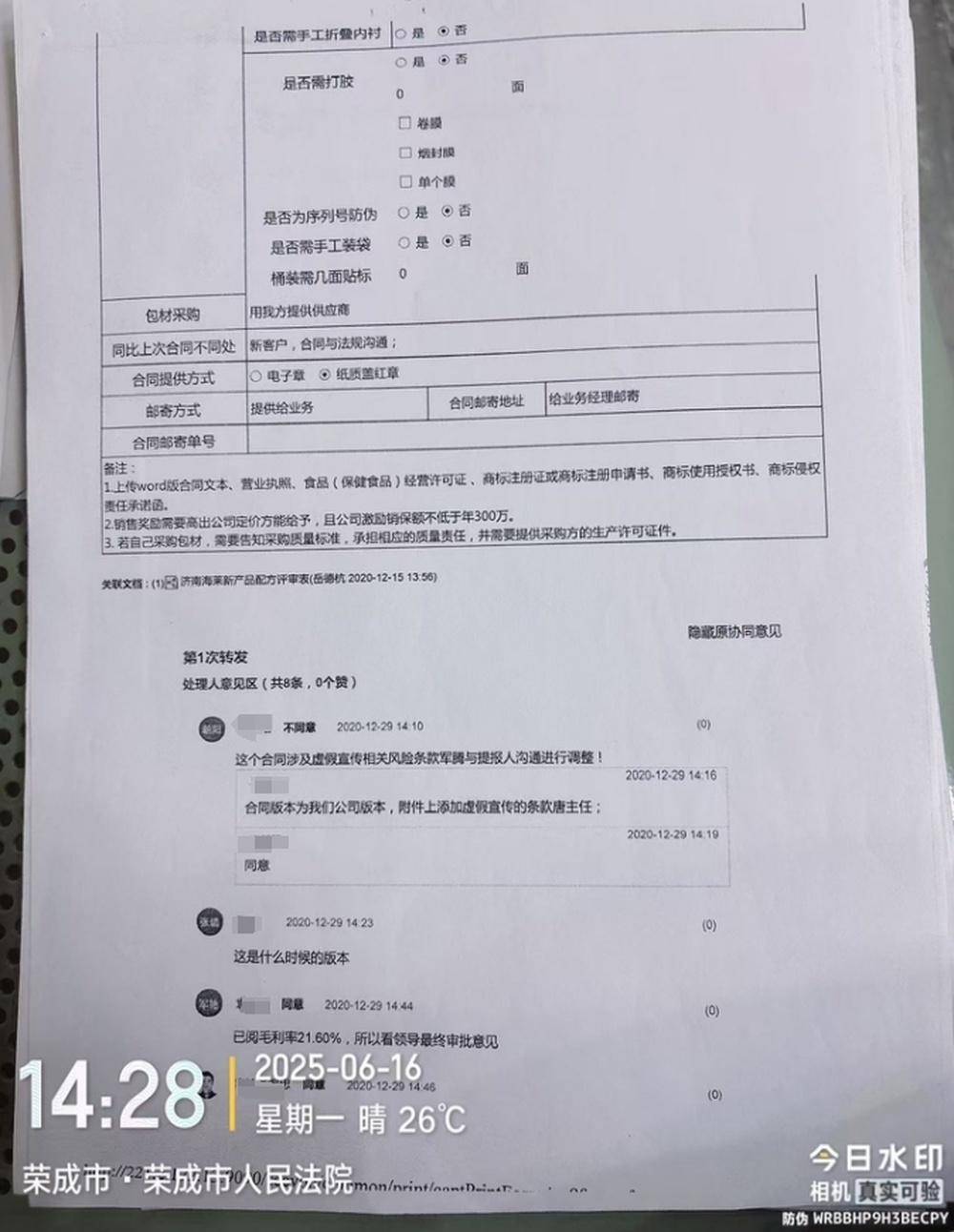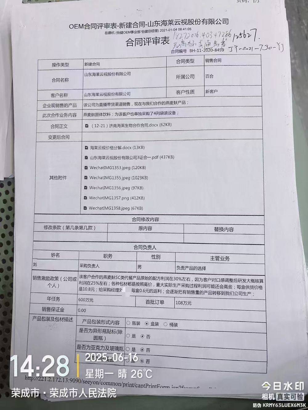 海莱云视的律师于今年6月初发现了这一线索,并于6月17日前往荣成市人民法院,通过阅卷程序对这份文件进行了带水印的拍照取证。这起“案中案”的发现,让原本的民事合同纠纷,蒙上了刑事犯罪的阴影。