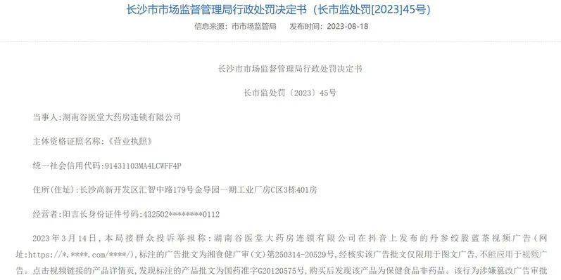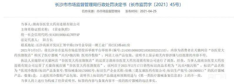 另外,记者在长沙市市场监督管理局官网看到,此前谷医堂曾因未按广告批文发布广告、标签内容与备案内容不一致等问题受到行政处罚。