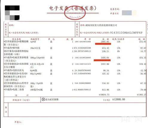 李先生向记者出示的电子发票记录显示,在理疗师刘某的指导下,其依次购买了5500元、12000元、6300元的药品,共计23800元,其中,发票中标明属于“营养保健食品”的价格达15878.91元,比总价的三分之二还多。不算税额,单价最贵的“营养保健食品”是鹿鞭筋糖果,平均一颗4克的糖果近105元;单价最贵的“中成药”是牡蛎苁蓉参精膏,平均一盒近3500元。