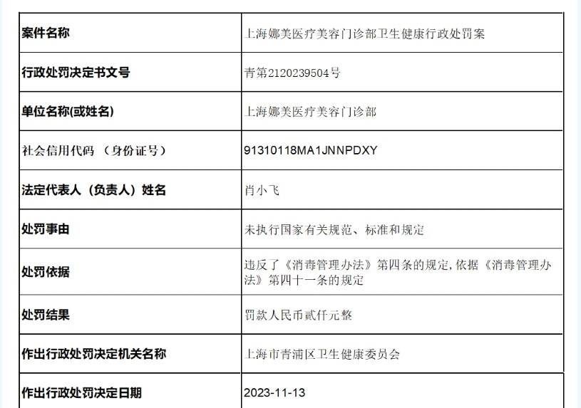 至2023年11月13日,上海娜美医疗美容门诊部再再一次被上海市青浦区卫生健康委员会处罚。原因是该门诊部未执行国家有关消毒规范、标准和规定,违反了《消毒管理办法》第四条的规定。依据《消毒管理办法》第四十一条的规定,上海市青浦区卫生健康委员会对其处以人民币贰仟元整的罚款。