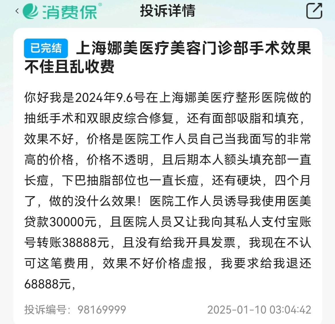 1月10日,一位消费者在消费保平台投诉称,其在上海娜美医疗美容门诊部进行的手术效果不佳,且该机构存在乱收费现象。消费者表示其接受抽脂手术、双眼皮综合修复、面部吸脂及填充项目后,术后效果令人失望。额头与下巴填充部位持续滋生痘痘并出现硬块,长达四个月未见任何改善。