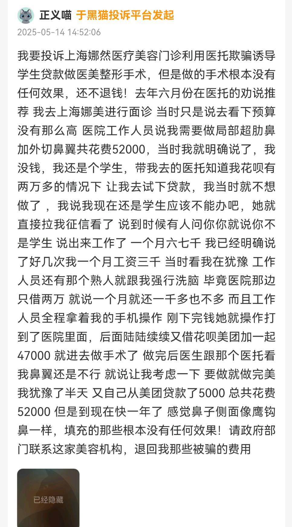 2025年5月14日,黑猫投诉上的消费者反映,称上海娜美医疗美容门诊部利用医托欺骗诱导学生贷款进行医美整形手术。