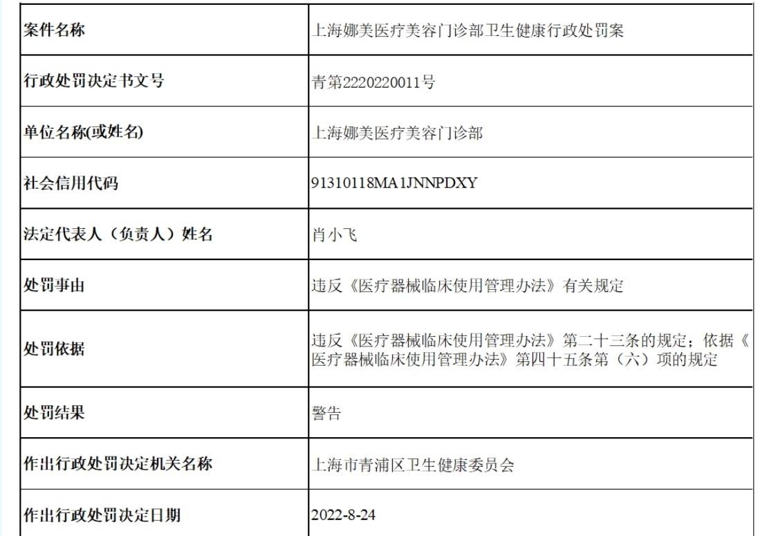 根据上海市青浦区人民政府披露,2022年7月27日,上海市青浦区卫生健康委员会对上海娜美医疗美容门诊部作出了一次行政处罚。