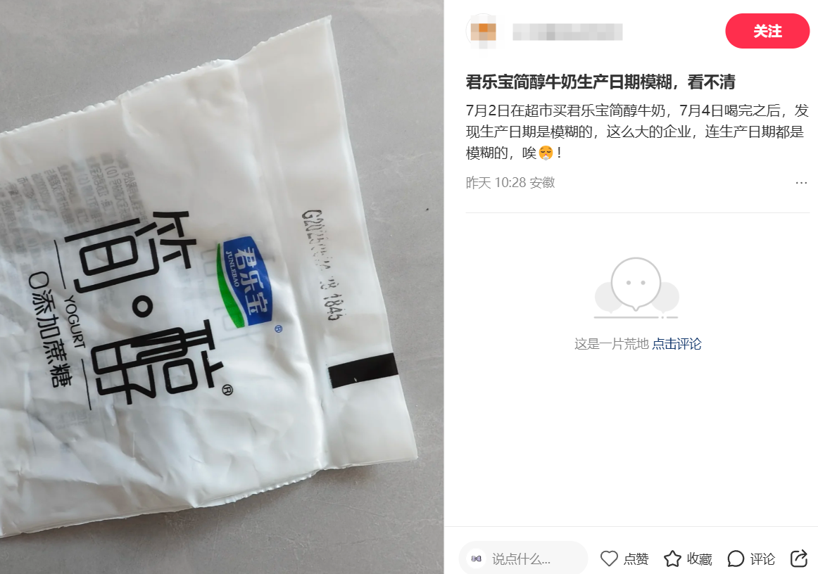 近日,安徽一网友在社交平台发布了牛奶生产日期模糊的问题引发关注,其于7月2日在超市购买的君乐宝简醇0添加蔗糖酸奶,7月4日饮用完毕后发现生产日期标识模糊不清。