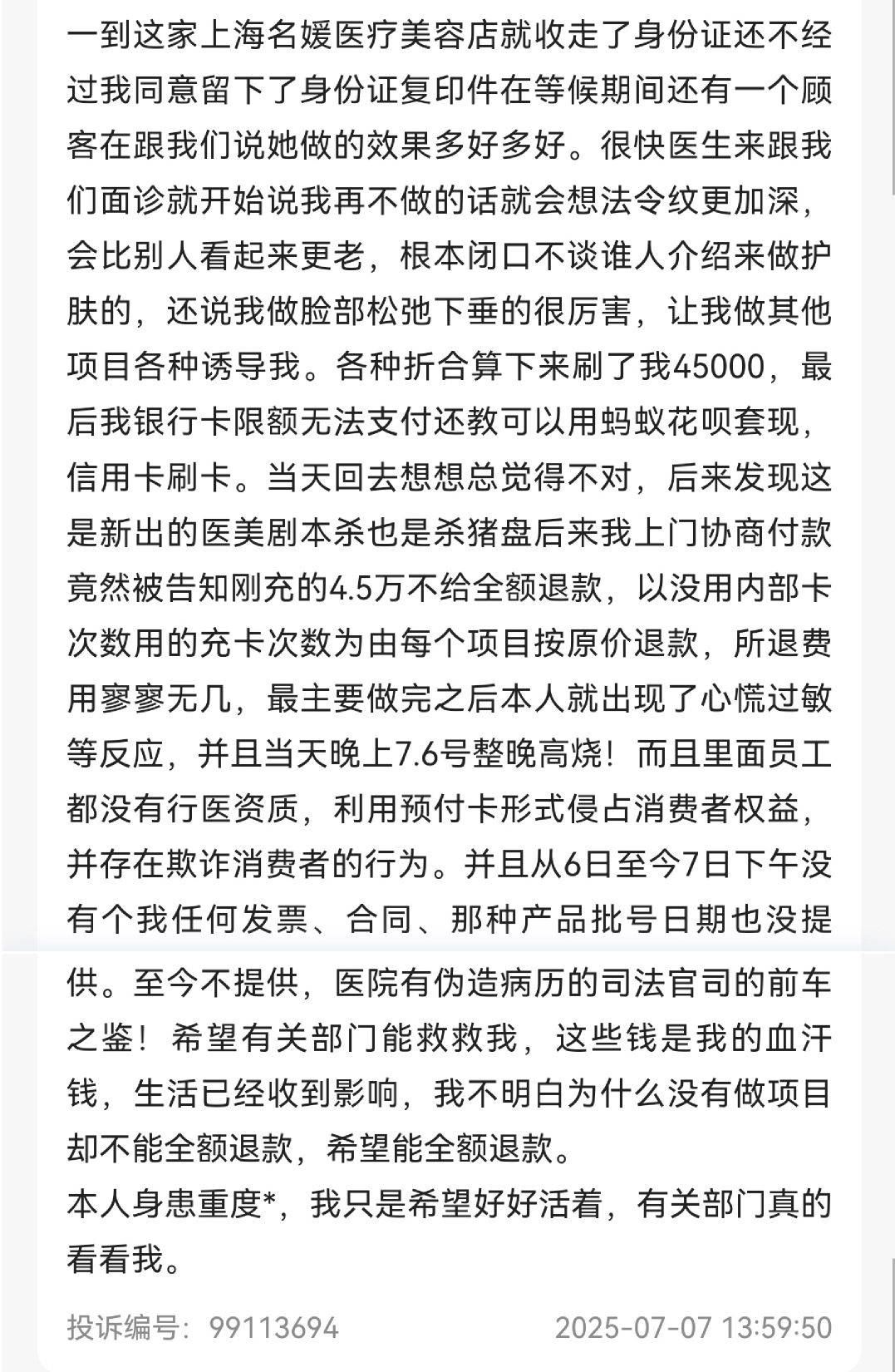 该消费者还提到,在该机构做完项目之后,该消费者就出现了心慌过敏等反应,并且于7月6日当天晚上整晚高烧。