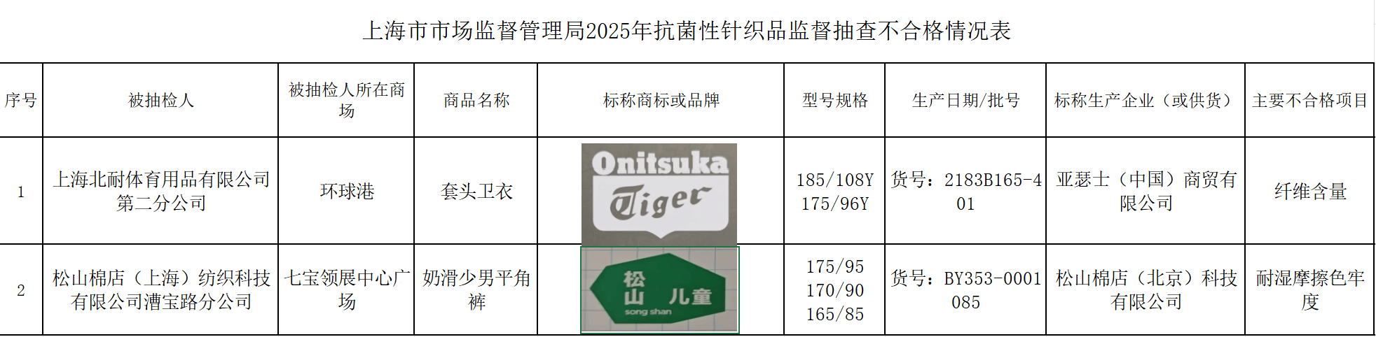 近期,上海市市场监管局发布抗菌性针织品监督抽查情况。其中,2批次产品抽检不合格。涉及品牌亚瑟士、松山棉店,不合格项目包括纤维含量、耐湿摩擦色牢度。