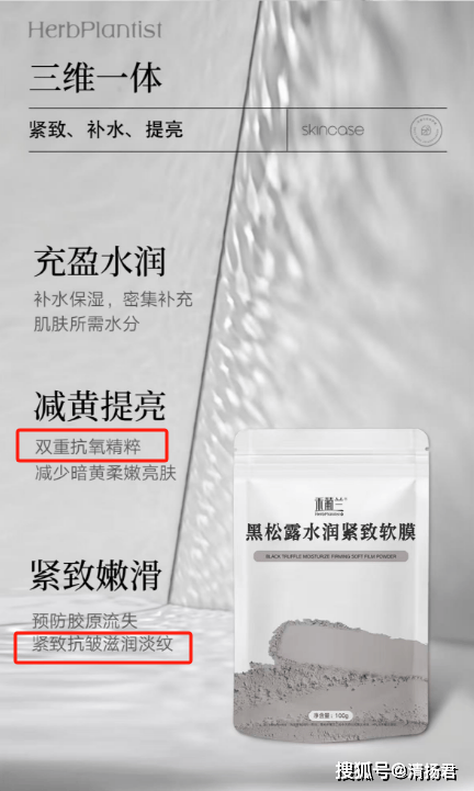 根据消费者张先生(化名)提供的线索,清扬君发现抖音平台的“禾葡兰HerbPlantist护肤”店铺销售的“禾葡兰黑松露水润紧致软膜100g”,在其详情页宣传“双重抗氧精粹”“紧致抗皱滋润淡纹”“硬核抗初老、更独特的抗老力”“促进EGF合成”“根源抗氧”“减少色素生成”“孕妇慎用:无”等内容。