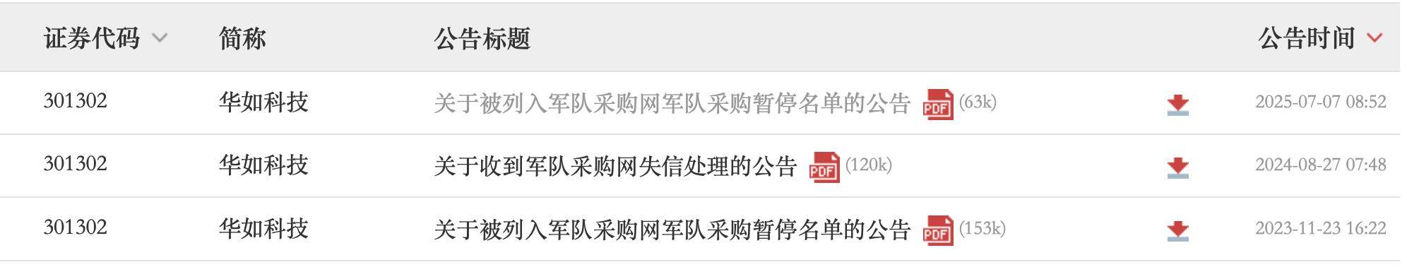 7月7日早间,华如科技(301302)公告,根据军队采购网(简称“军采网”)发布的军队采购暂停名单,自2025年7月4日起,暂停公司参加空军范围物资工程服务采购活动资格。