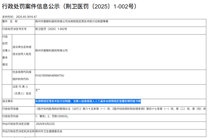此外,华厦眼科旗下还有子公司不按手术流程开展诊疗活动,如今年5月份,荆州华厦眼科医院有限公司被查处发现,该医院存在“未按照规定落实术前讨论制度、当事人给患者植入人工晶体未按照规定签署知情同意书等”违规情形。
