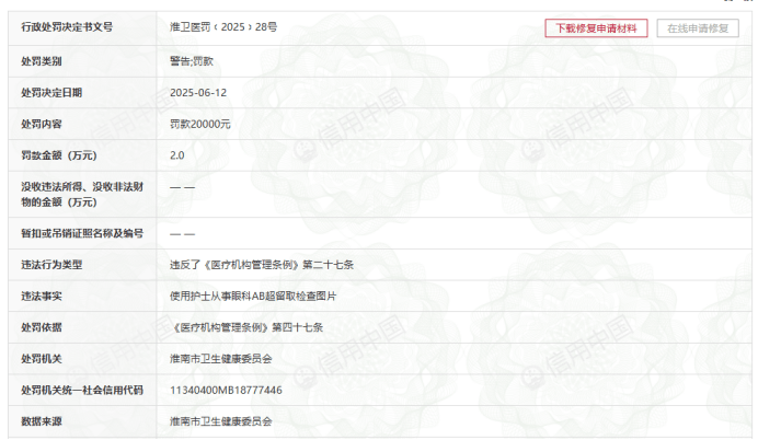同样在今年6月中旬,淮南华厦眼科医院有限公司被当地监管部门查处发现,该医院使用护士从事眼科AB超留取检查图片,即存在使用非卫生技术人员从事医疗卫生技术工作的违规行为,被处以2万元罚款。
