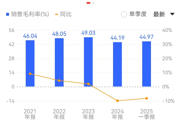 数据显示,2021年至2024年华厦眼科的毛利率分别为46.04%、48.05%、49.03%、44.19%,同样在2023年见顶后2024年出现大幅下滑,至2025年一季度华厦眼科毛利率仍然只有44.97%,同比不及2024年一季度的48.97%。