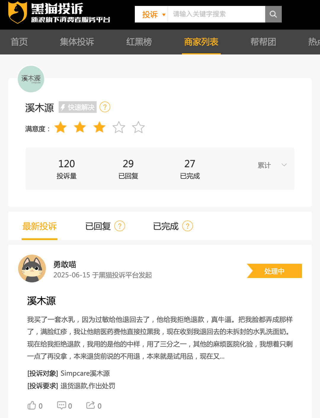 有消费者反映,在溪木源京东旗舰店因过敏申请退货时,客服竟要求退回已开封使用的小样,否则拒绝履行“90天过敏退”承诺;此外,在溪木源天猫超市换购活动中,有消费者下单溪木源“水乳套装”仅收到单件产品,客服却以系统显示“精华水”为由拒绝补发,品牌被质疑涉嫌虚假宣传。