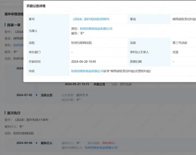 值得一提的是,花西子并不是只对这两家自媒体提起诉讼。公开信息显示,花西子曾在杭州互联网法院对十余名自然人提起了网络侵权诉讼,但与在海淀法院提起的指控不同,在杭州互联网法院主要指控的是侵犯名誉权。在披露的一起判决中,杭州互联网法院判决被告给予花西子500元损害赔偿。