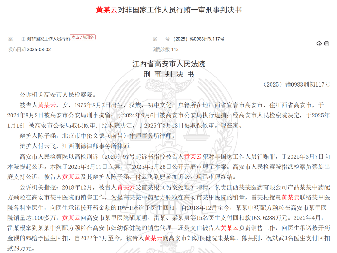 这则判决书显示,某配方颗粒代表黄某云给予高安2家医院数十名医生回扣共计192.6288万元,回扣比例8%-15%不等,被判处有期徒刑三年,缓刑三年,并处罚金人民币五万元,上级代理商雷某根另案处理。