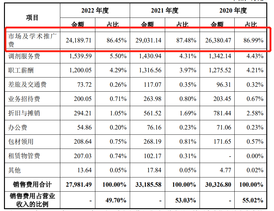 百神药业的销售费用中,市场及学术推广费是大头,占比超86%。2020年至2022年,其市场及学术推广费分别为2.64亿元、2.9亿元、2.42亿元,分别占销售费用比例为86.99%、87.48%、86.45%。