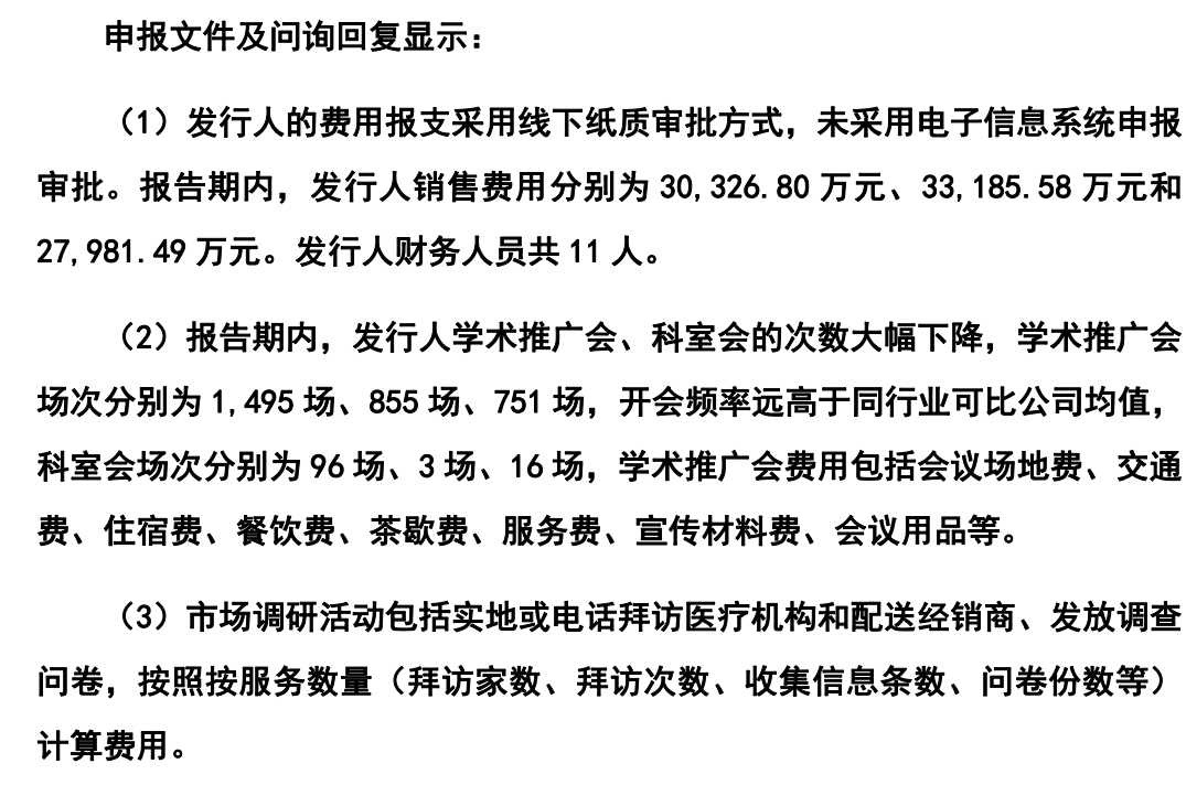 其中,学术推广会议包括为公司产品推广而开展的各类区域推广会、科室会、营销策略会,目的系向一线医务人员、经销商介绍产品特点、临床使用方法等,使其能够及时了解产品信息,了解产品的作用机理等。市场调研主要是委托推广服务商组织,通过拜访、分发调查问卷信息收集等方式获取市场基本情况、公司产品用户反馈情况、竞品市场信息等相关产品市场信息而进行的市场调研活动。