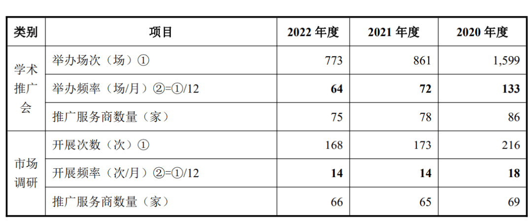 深交所问询函中提到,百神药业的学术推广会场次分别为 1495 场、855 场、751 场(累计达3100场),开会频率远高于同行业可比公司均值。