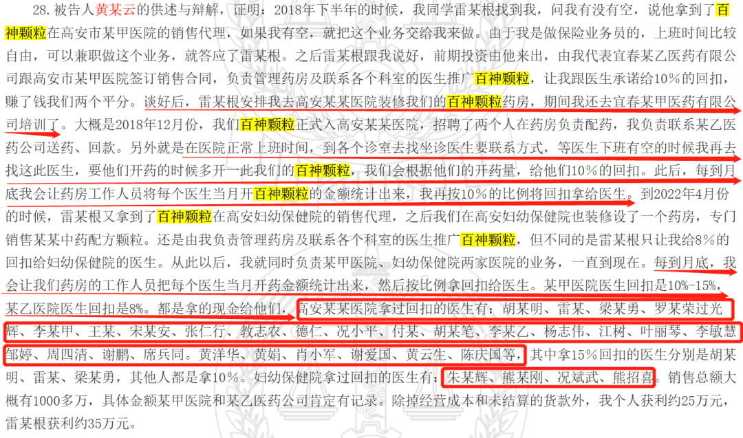 黄某云还有一项非常重要的工作就是勾兑上医生。据她表示,在医院正常上班时间,她会到各个诊室去找坐诊医生要联系方式,等医生下班有空的时候再去找这此医生,要他们开药的时候多开一此百神颗粒,“我们会根据他们的开药量,给他们10%的回扣”。此后,每到月底我会让药房工作人员将每个医生当月开百神颗粒的金额统计出来,我再按10%的比例将回扣拿给医生。