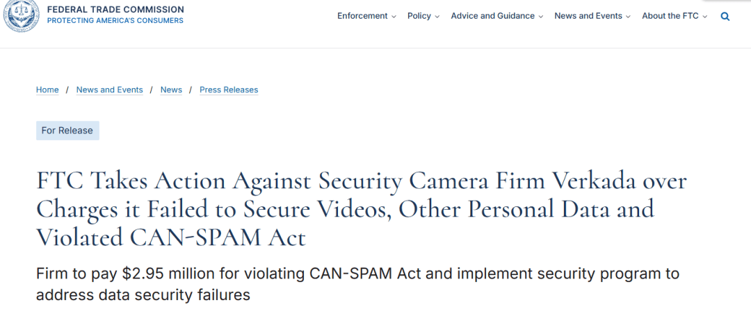 类似的还有 Verkada 安防摄像头泄露案,黑客入侵后可实时查看医院、学校乃至企业的内部画面,美国联邦贸易委员会(FTC)对此展开调查,最终要求 Verkada 支付 295 万美元的罚款。
